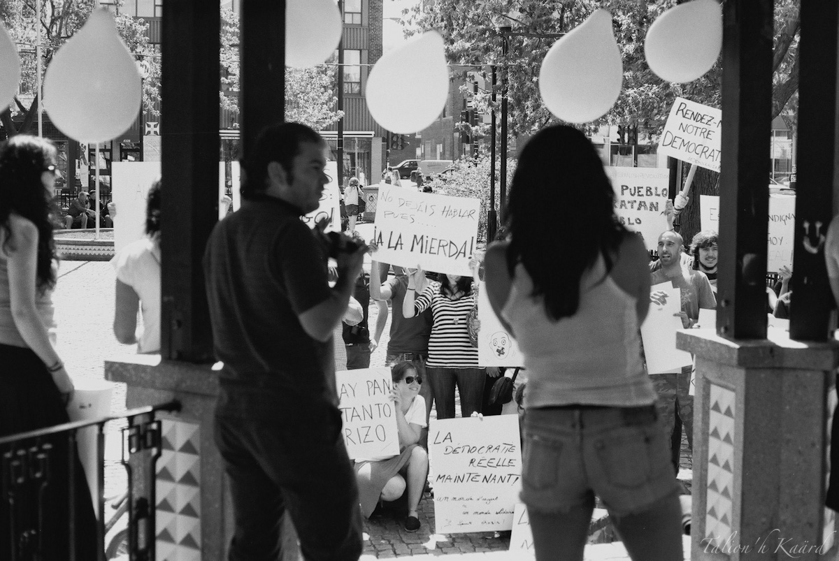 Voila plusieurs mois que cette pellicule fleurissait dans l'appareil, et il est toujours difficile de faire la dernière photo. Celle qui vous poussera à vous rendre chez votre tireur nonchalamment, pour enfin savoir si l'idée qui vous tenait durant tout ce temps s'anime un peu le long de 34 poses. L'idée de départ, elle s'est enclenchée à la première prise de vue : un rassemblement de compañero(a)s espagnol soutenant une lutte internationale, là bas, à l'autre bout de l'océan.